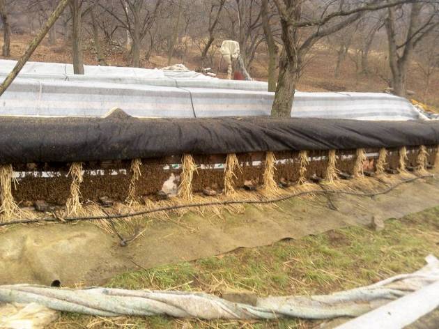 겨울과 봄에는 이렇게 벌통을 보온덮게로 덮어서 추운 겨울에 벌들이 얼어죽지 않게 버티는 시기야.