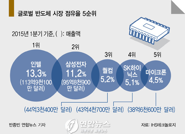 2) 삼성과 SK하이닉스가 세계 5위권 안에 들어감.