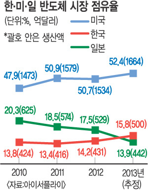 또 우리나라의 반도체 산업은 꾸준한 성장으로 시장 점유율에서 일본을 꺾어서 (2013)