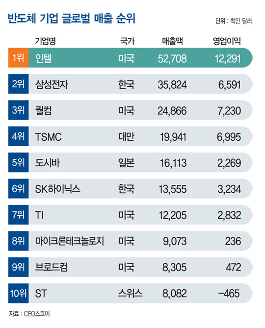 삼성전자와 SK하이닉스가 세계 5위권 안에 들어가고 있어.