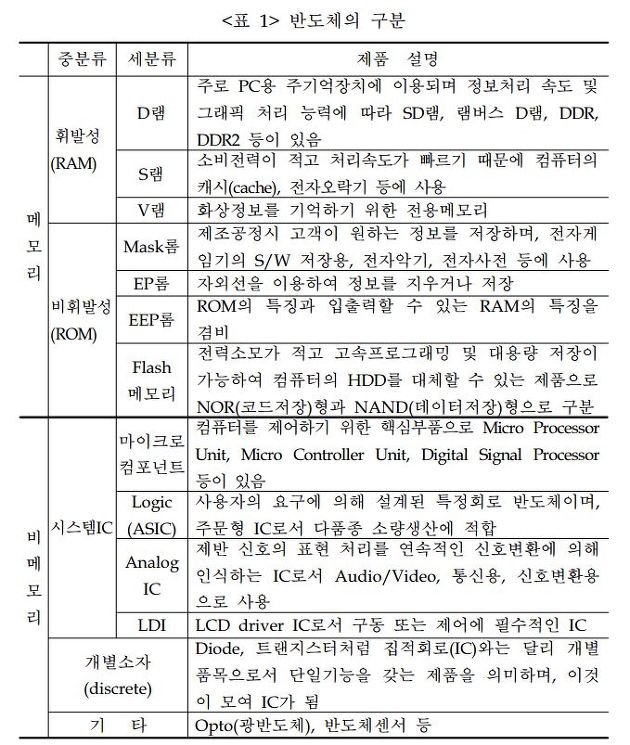 반도체의 구분은 크게 메모리 반도체와 비메모리 반도체로 구분되는데