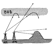 AM파는 전리층에 맞아서 굴절이 되서 멀리멀리 나가지만 FM파는 그냥 뚫고나가버려, 그리고 회절성도 약하기 때문에 산이나 건물에 막혀서 운지하는 경우도 있어.