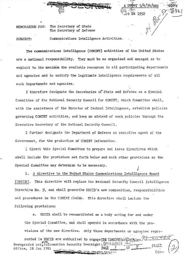 ( 해리 트루먼 대통령의 NSA 설립에 관한 1급 기밀문서이고 1981년에 기밀해제됬으나 시간이 지나고 이후 미국 정보공개법에 따라 공개된 문서)