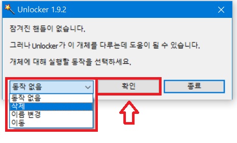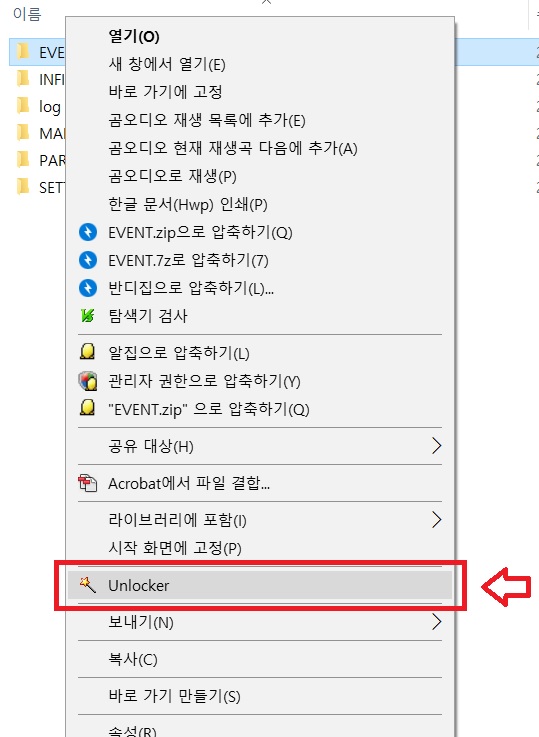 3. 파일설치가 완료되면 폴더및 파일의 오른쪽 마우스클릭시 하기 사진과 같은 Unlocker 탭이 추가로 생성됨, 삭제할 폴더 및 파일에 가서 우클릭후 Unlocker를 실행