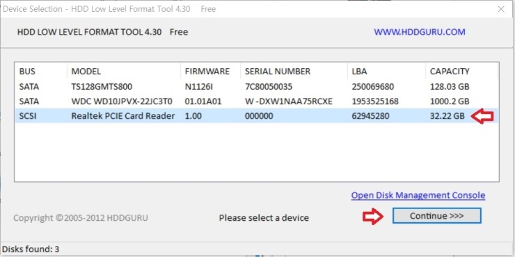 3. 아래 디스크 목록에서 원하는 디스크 선택후 Continue >>> 클릭