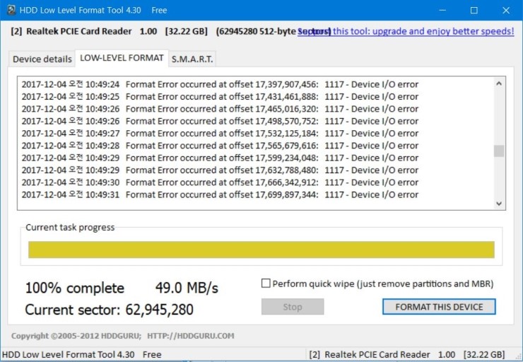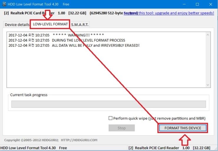 4. Low-level format 탭으로 이동후 Format this device 클릭