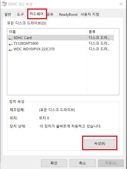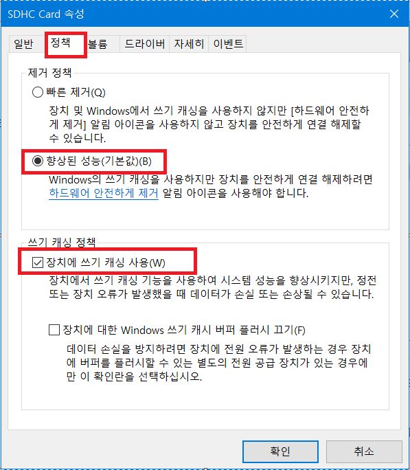 정책탭 - 향상된성능 - 장치에 쓰기캐싱 사용