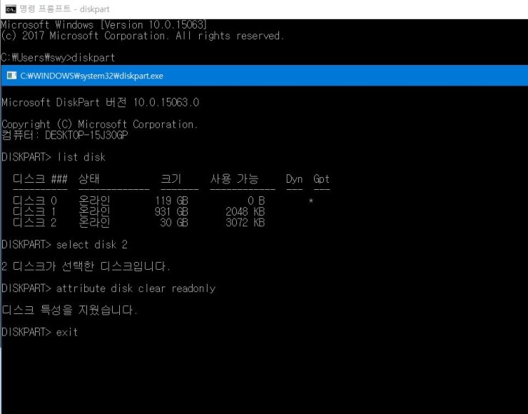 diskpart - list disk - select disk 3 (해당 드라이브) - attributes disk clear readonly - exit