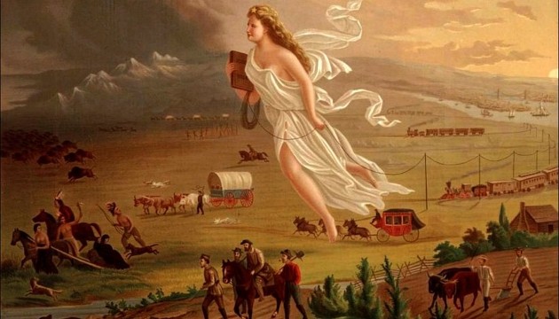 중간에 서쪽으로 향하는 천사는, 동부의 식민지인들의 개척이 신의 뜻과 같다는 걸 상징한다.