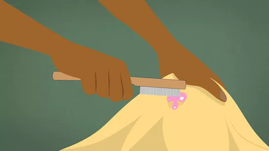 칫솔을 이용해 껌 붙은 부위에 휘발유를 살짝 바르고 문지르면 껌을 떼낼 수 있습니다. 휘발유 대신 전자레인지에 5~10초 데운 따뜻한 코코넛 오일을 바른 후 칫솔을 이용해 떼낼 수도 있습니다.
