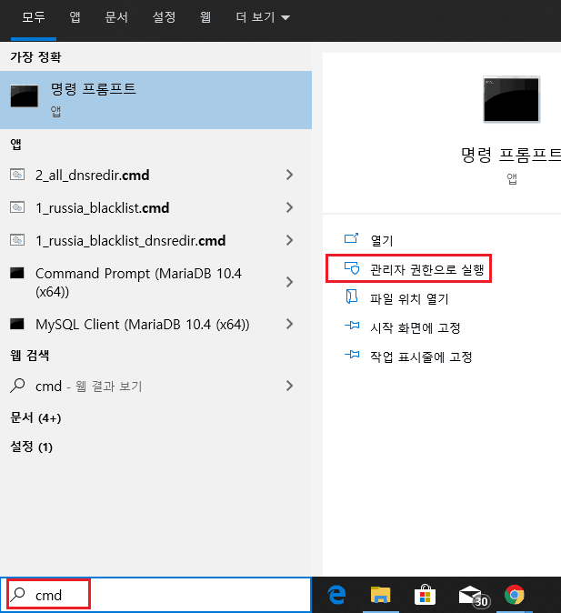 1. 윈도우키를 눌러 좌측 하단 검색메뉴바에서 CMD를 입력하고 명령 프롬프트 창을 관리자 권한으로 실행합니다.