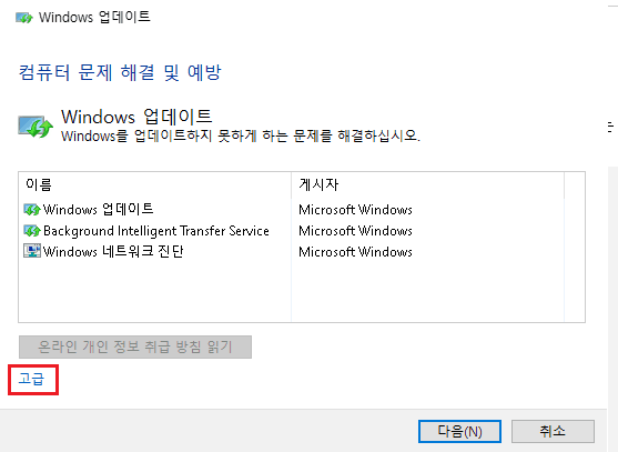 업데이트 문제 해결사 프로그램 실행 후 고급 설정 진입