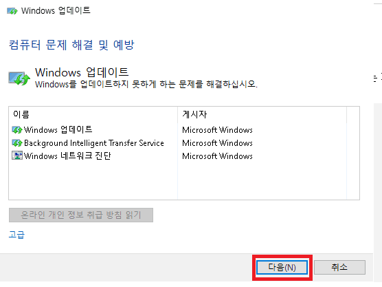 3. 마이크로소프트 제공 윈도우 10 업데이트 오류 해결 프로그램