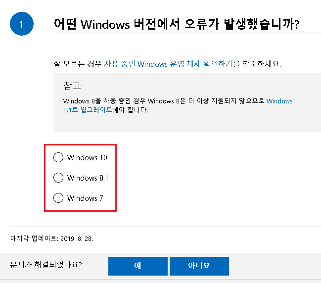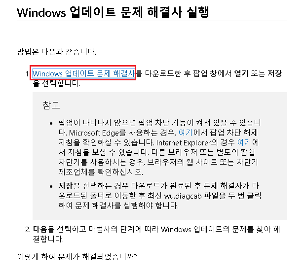 1. 마이크로소프트 윈도우즈 업데이트 오류 해결 페이지로 들어갑니다.