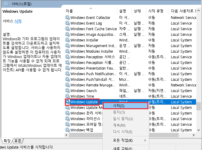 Windows Update 마우스 오른쪽 버튼 클릭 후 “시작(S)” 클릭