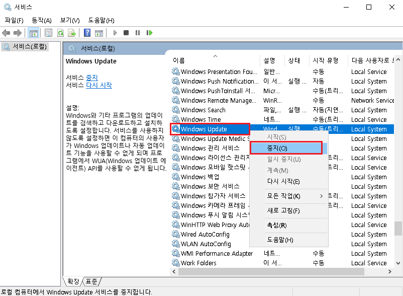 2. 서비스 설정 관리창에서 Windows Update를 찾으신 후 마우스 오른쪽 버튼을 클릭하시고 “중지”를 클릭하여 윈도우 10 업데이트 서비스를 중지합니다.