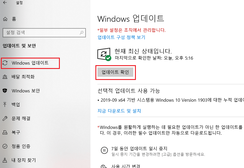 Windows 업데이트 확인 클릭해서 현재 업데이트 상태 확인