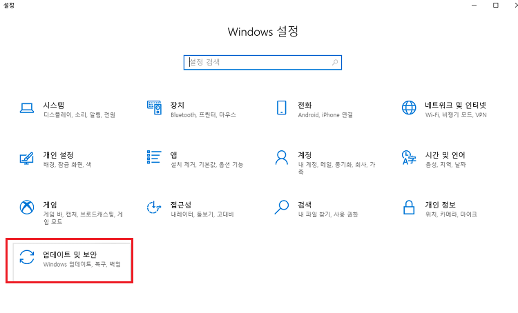 5. 윈도우 업데이트 및 보안 창을 열어서 업데이트를 해보겠습니다. 윈도우키+ i 를 입력하시고 Windows 설정 창을 열어주세요. 좌측하단 검색 메뉴바에서 “설정”을 입력하여 Windows 설정 창을 여실수도 있습니다.