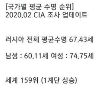 그외에도 러시아는 남성의 평균수명이 59세~60세로 굉장히 낮고