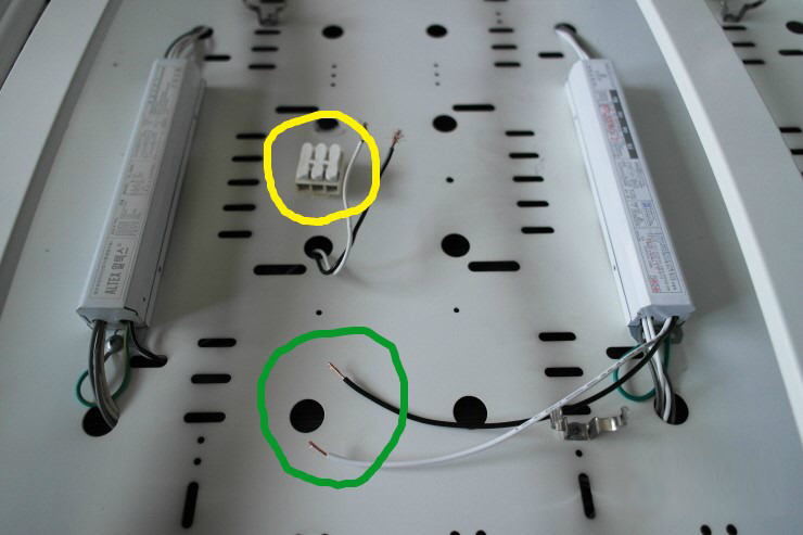 안정기의 선(녹색원)이 배선커넥터(노란색원)까지 가기는 짧은 상황