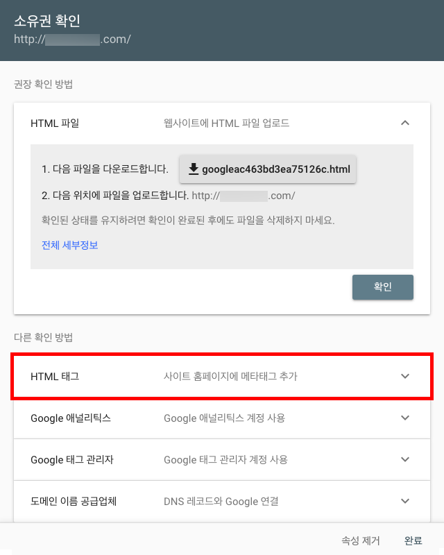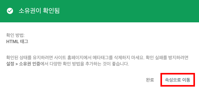 소유권이 확인창이 뜨면, 이제 Google 검색 로봇이 며칠 이내로 내 사이트를 수집하여 검색 결과에 반영하기 시작합니다. 더 효과적으로 페이지를 수집할 수 있게 하려면 속성으로 이동을 클릭해, 아래 2단계를 완료하세요.