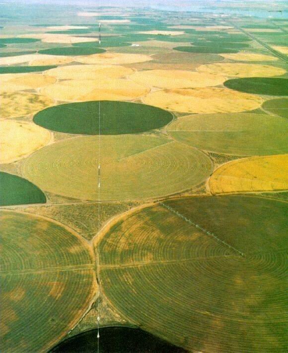미국의 밭이 동그란 이유는 저 가운데에 스프링쿨러가 있음. 그래서 스프링쿨러가 말도 안되는 양의 물을 뿌려줘서 원형밭이 생김