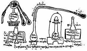 [이해를 돕기 위한 사진 / 중세 연금술사가 증류기를 이용하고 있다.]