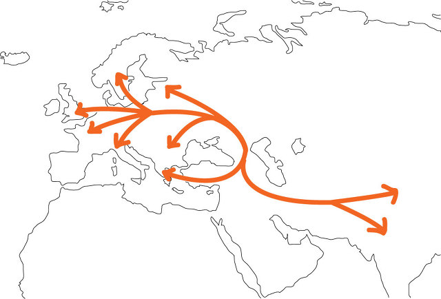 이건 유럽의 언어인 인도-유러피언 어족의 확산 경로입니다.