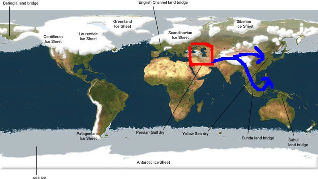 마지막 빙하기때의 지도인데, 몽골로이드는 저 추운 지역을 뚫고 ...다시 말해 추위를 정통으로 쳐맞으면서 동진했다고 보고, 코카소이드들은 비교적 살만했던 빨간 네모 지방에서 버티고 있다가 지구가 따뜻해지면서 서진 했다는 이야기.