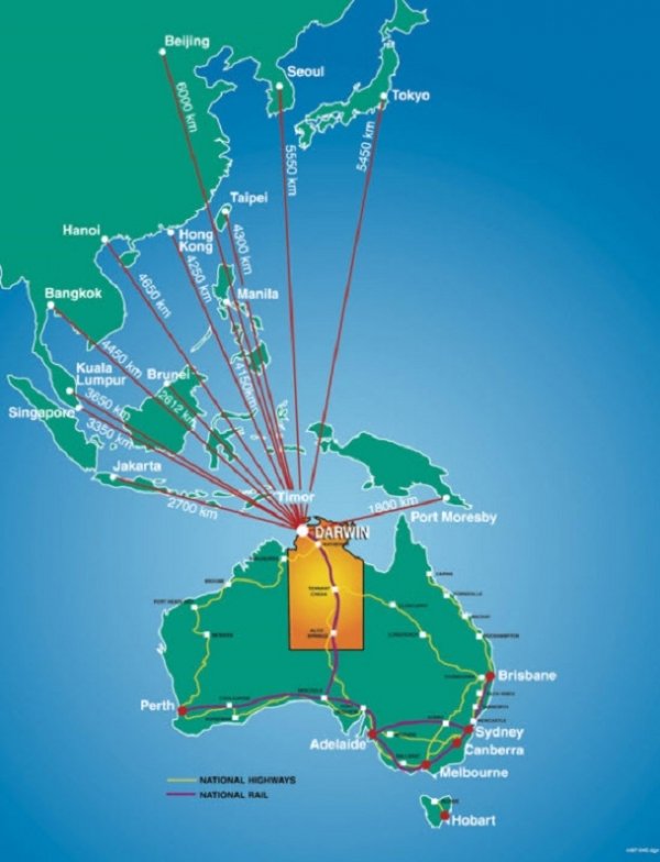 36. 중국 수입원유의 80%가 지나는 말레카해협과 인도네시아, 말레이시아, 필리핀등을 바라보는 요지에, 2,500명의 미군 해병대가 주둔하고 있는호주 유일의 미군기지가 있어 미국 입장에서도 태평양 작전거점중의 하나임