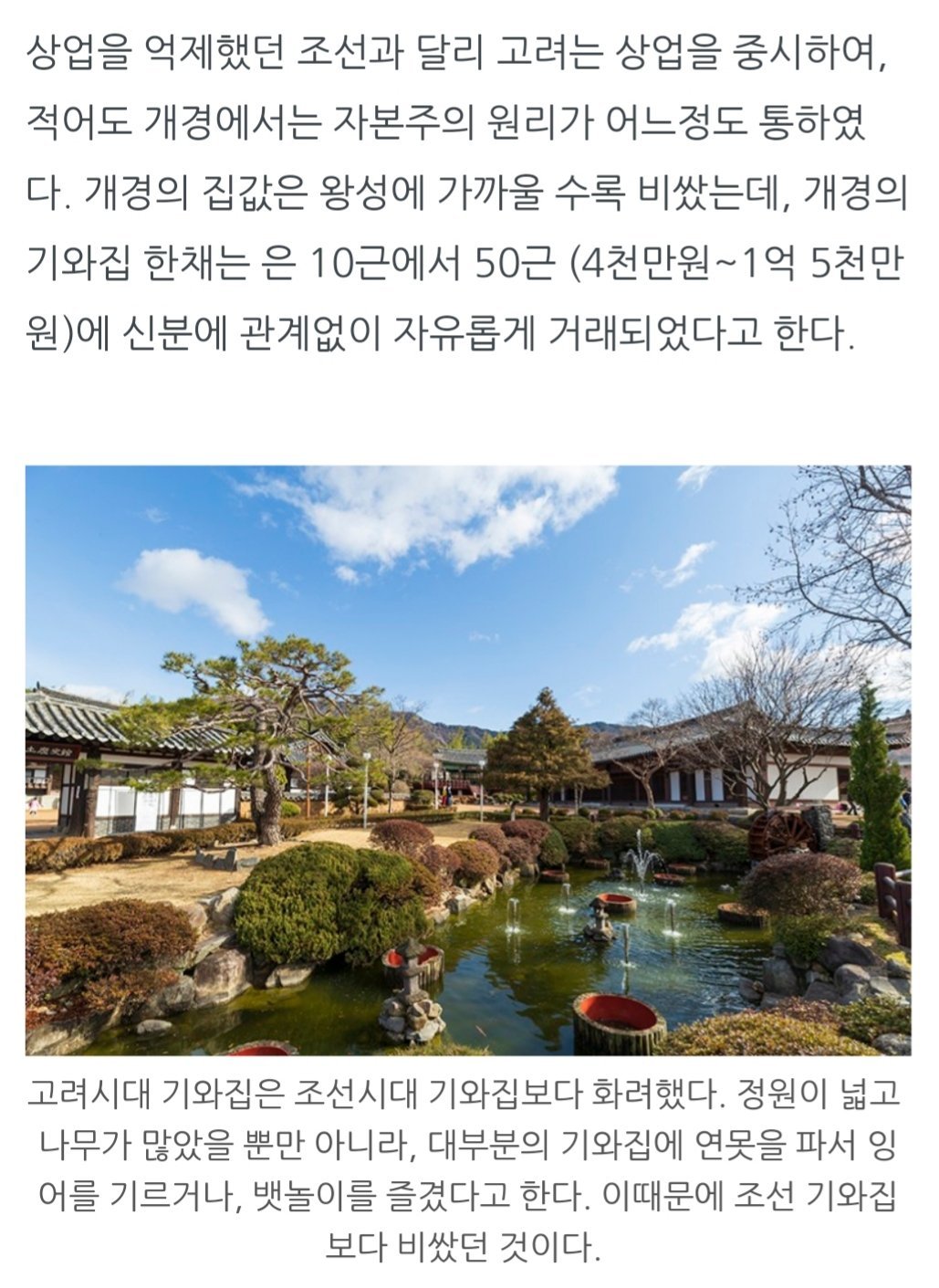-> 조선에선 양반이 아니면 기와집에 살 수 없었지만 고려에서는 돈만 있으면 평민도 기와집을 살 수 있었다. 이는 고려사회가 자본주의 시스템을 어느정도 수용하고 있었다는 방증인데, 그 뿐만이 아니다