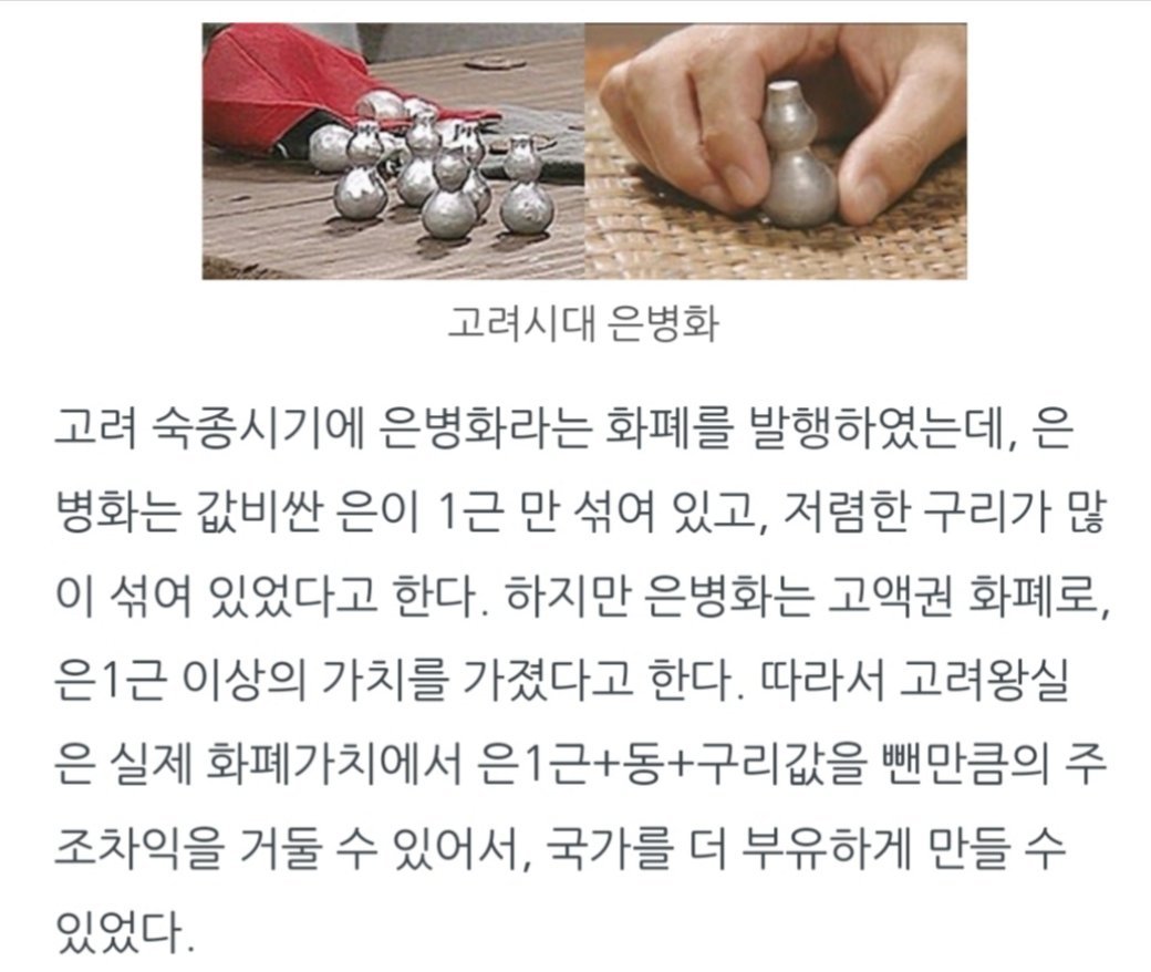 ※ 고려의 대표적인 고액화폐 은병화. 화폐 생산 비용보다 화폐 가치가 더 높았기 때문에 정부의 재정이득은 더욱 극대화 되었다.