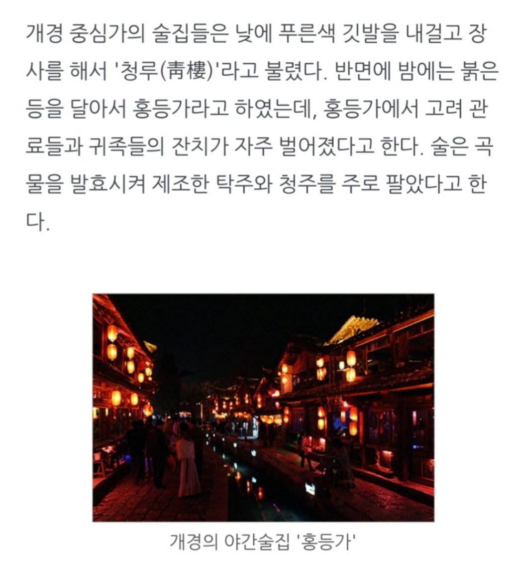 -> 고려시대 개경에는 술집이 아주 많았는데 낮에는 '청루', 밤에는 '홍등가'라 불렸다.