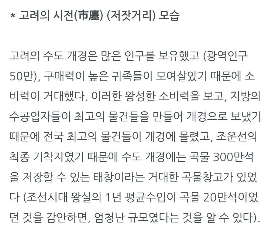 -> 중세 고려의 황도 개경은 인구가 50만에 육박하는 세계 최대 규모의 대도시 중 하나였는데, 개경 귀족들의 높은 소비력은 생산에 활력을 불어넣었고 상품의 질을 극도로 향상시켰다.