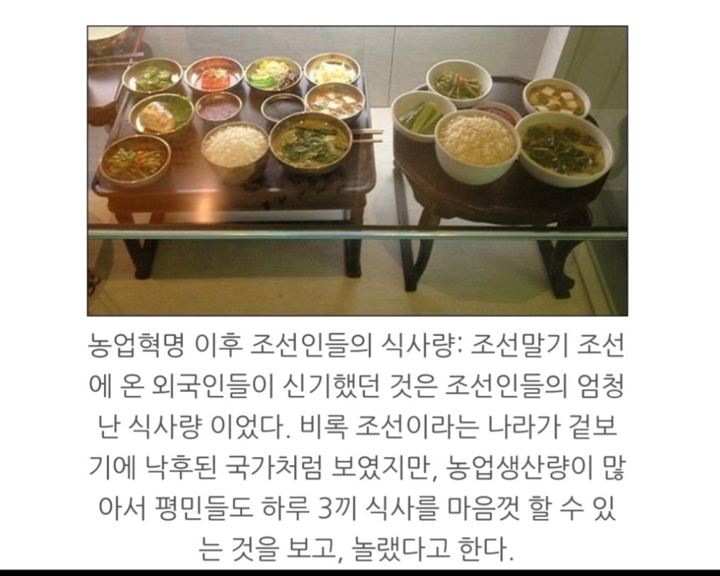 <반면> 검약을 미덕으로 여겼던 조선은 소비가 위축되고 그에따라 생산과 내수시장이 마비되었으며, 국가의 년 재정 수입은 고작 20만 석에 불과했기 때문에 조선의 백성들에게 가난은 숙명이나 마찬가지였다. (오늘날 북한의 현실과 소름돋을 정도로 유사한 조선의 시스템