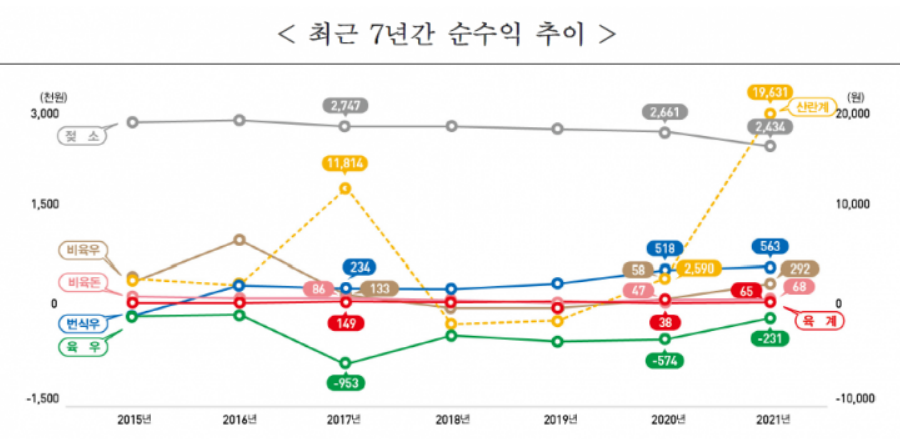 43. 통계청 발표를 보면 산란계 한 마리당 수익이 2,590원에서 1만 9,631원으로 7.6배가 뛴 것으로 확인됨.