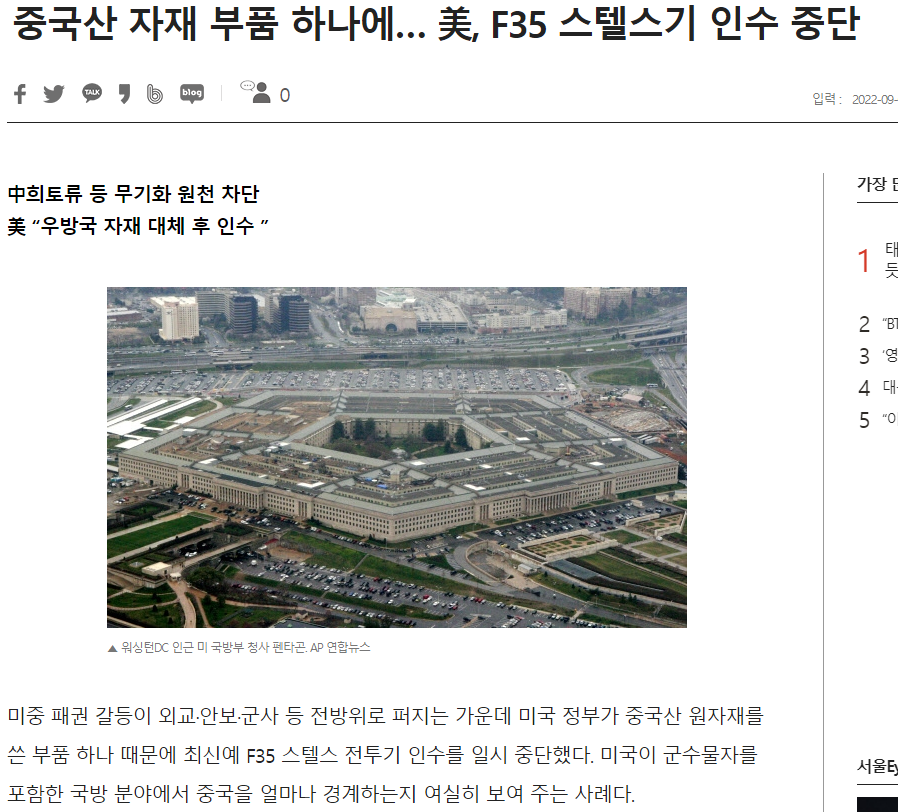 최근 미국이 중국산 원자재를 쓴 부품 하나 때문에 F35 스테르 전투기 인수를 일시 중단했다는 기사가 나옴.