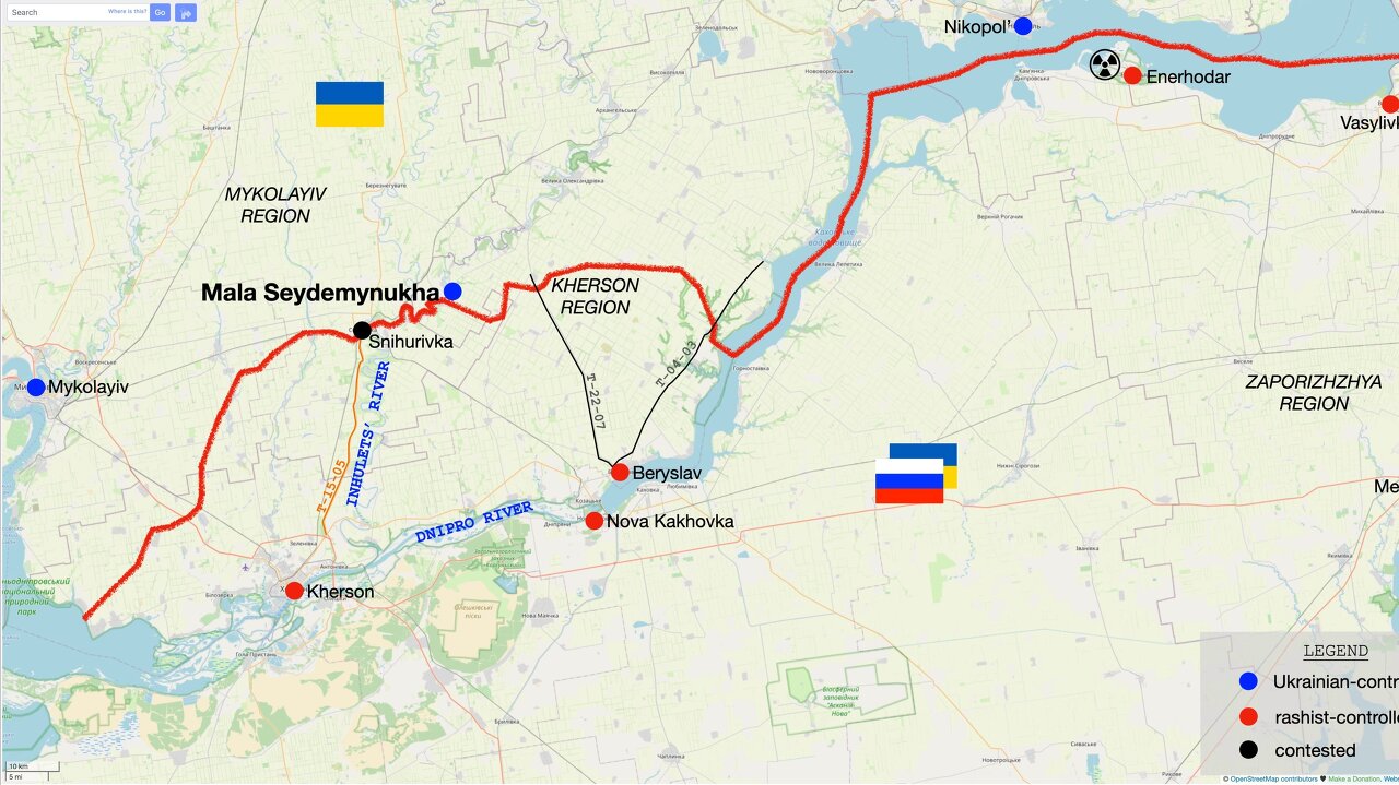 2. 지도 보면 알 수 있듯이 헤르손에 지원을 하려면 드니프로 강을 건너가야 함. 또한 헤르손은 강 때문에 방어 병력이 고립되어 있고 파르티잔에 계속 시달리고 있음. 스탈린그라드처럼 물자를 무제한으로 투입하는 대신 헤르손에서 철수하고 방어선을 드니프로 강에 설치하는 것으로 바꾸었다고 함.