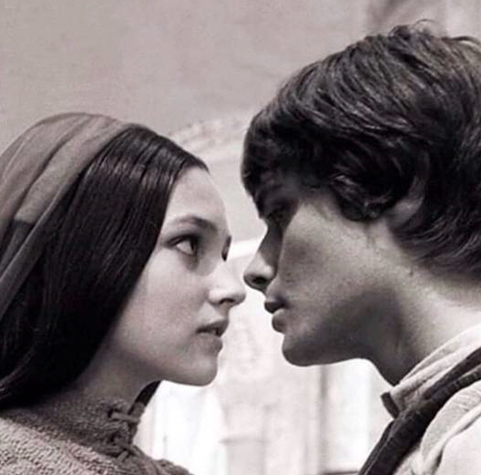 사진 속의 올리비아 핫세는 남자 주인공과 얼굴을 마주보고 서서 서로의 눈을 바라보고 있다.