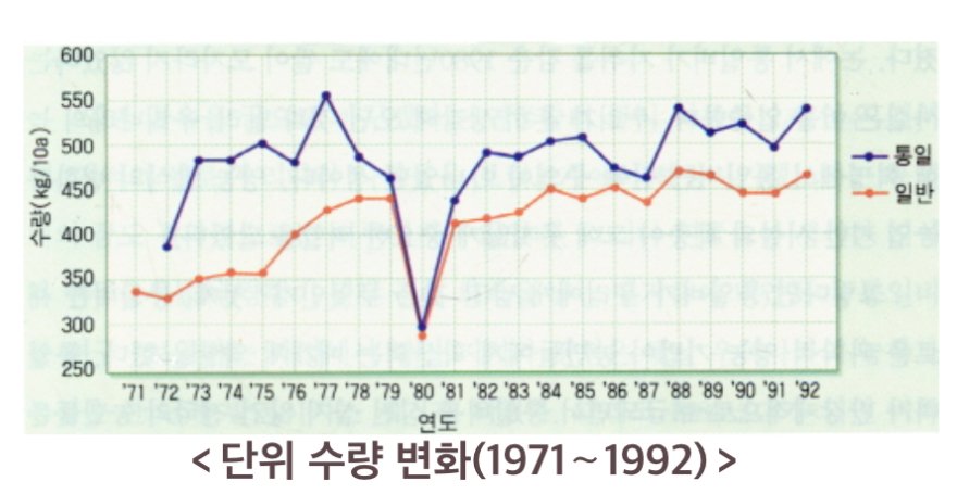 통일벼가 도입되고 쌀 생산량이 30% 넘게 올랐고 통일벼는 일반미보다 훨씬 저렴하게 거래되었다.