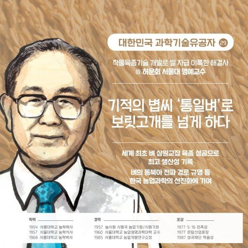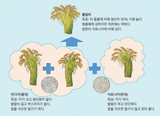 통일벼는 허문회 서울대 명예교수가 자포니카형 품종과 인디카형 품종을 인공 교배하여 얻은 1대 잡종에 IR8을 3원교배하여 개발하였다.