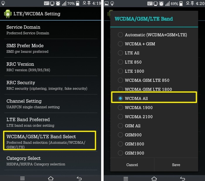 3G유심을 끼워 사용중이니 이 세팅화면에서 아래와 같이 WCDMA ALL로 바꿔 줍니다.