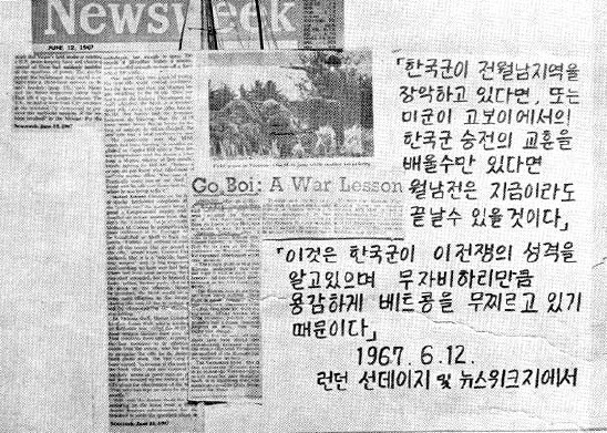 월남의 모든 사람을 다 제쳐놓고 60만 한국군에게 전쟁을 맡겨 보는 것이 어떨까? 5만에 불과한 한국군은 적의 구정 공세 기간 중 전술 책임 구역 내에 침입한 적을 단 하루 만에 격퇴했다...... 베트콩의 항불전쟁 이래 베트콩에 장악되어 있던 중부 해안 지대가 지금은 한국군에 의하여 완전히 통합되고 있다